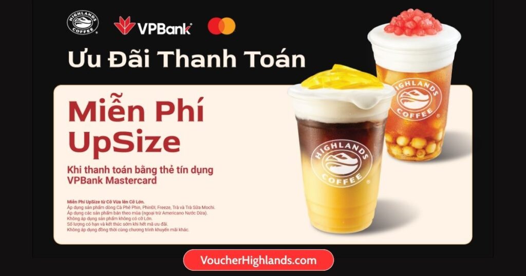 Tóm tắt: Từ ngày 04.08 – 31.12.2025 khi dùng thẻ VPBank Mastercard có mã đầu BIN: 520399, 523975, 524394, 518966 thanh toán tại Highlands Coffee bạn sẽ nhận được ưu đãi Miễn phí Upsize cỡ Vừa → Lớn. Áp dụng toàn quốc. Dòng sản phẩm áp dụng: Cà Phê Phin, PhinĐi, Freeze, Trà, Trà Sữa Mochi. Để thêm thông tin chi tiết bạn kéo xuống dưới nhé!